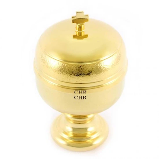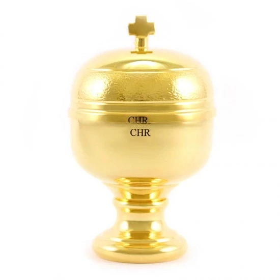Vasetto per olio Santo Crisma realizzato in metallo dorato liscio con interno in vetro. Sistema di apertura sicuro e pratico con filettatura, svita e avvita, munito di coperchio in plastica bianca per evitare perdite. Made in Italy