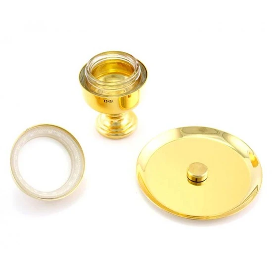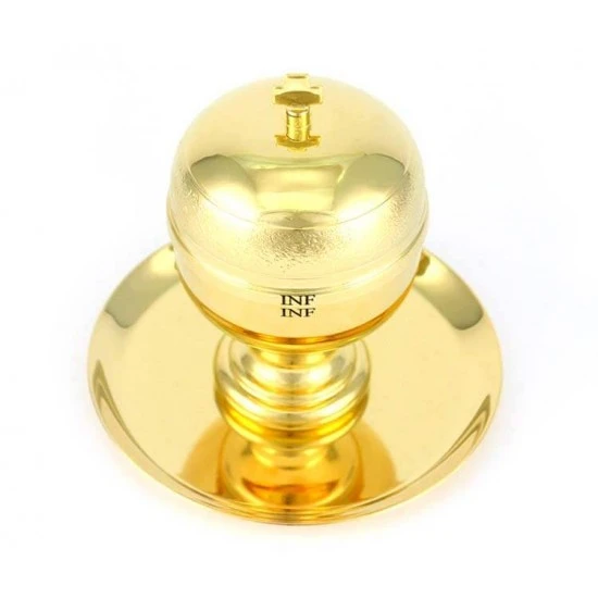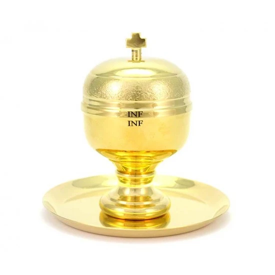 Vasetto per olio Santo Infermi realizzato in metallo dorato liscio con interno in vetro. Sistema di apertura sicuro e pratico con filettatura, svita e avvita, munito di coperchio in plastica bianca per evitare perdite. Il vasetto è corredato di piattino in stile. Made in Italy