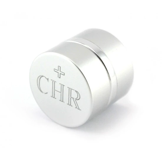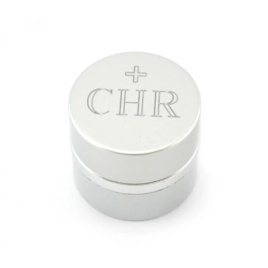 Vasetto per olio Santo Crisma realizzato in alluminio argentato. Il tappo è decorato da una crocetta incisa e la scritta CHR, ed ha un sistema di apertura sicuro e pratico con filettatura, svita e avvita. Made in Italy