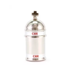Vasetto per olio Santo Crisma realizzato in ottone argentato con interno in vetro estraibile. Il tappo è decorato con una crocetta piatta ed ha un sistema di apertura sicuro e pratico con filettatura, svita e avvita. Made in Italy