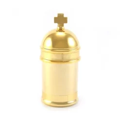Vasetto per olio Santo Infermi realizzato in metallo argentato. Sistema di apertura sicuro e pratico con filettatura, svita e avvita. Confezionato in astuccio con chiusura a ciappetta. Made in Italy